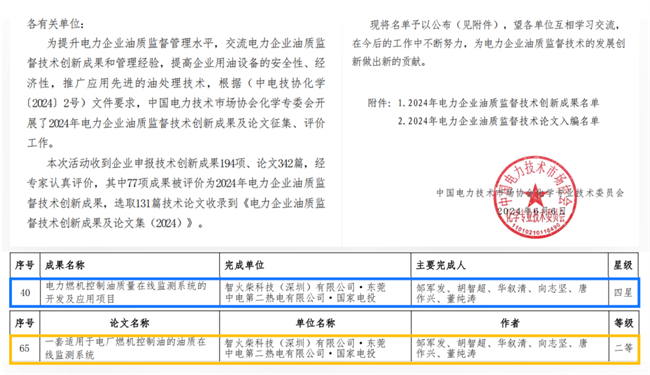 此外,智火柴科技在2024年電力企業油質監督技術創新成果及論-文征集活活動中,以《一套適用于電廠燃機控制油的油質在線監測系統》為題的成果文章成功入編《電力企業油質監督技術創新成果及論-文集(2024)》,被評選為二等獎論-文、四-星-級成果獎!