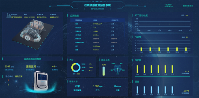 該系統由安裝在現場的監測傳感器、數據處理及傳輸系統、數據分析診斷平臺等組成,具備實時采集油溫、含水量、運動黏度、金屬磨粒、顆粒污染度等質量指標功能。