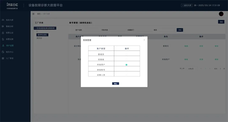 ■ 用戶設置權限分級:主要分為管理員、經銷商、終端用戶、體驗賬號、運維人員五大賬戶類型,實現專機專管,靈活分配設備管理權限。