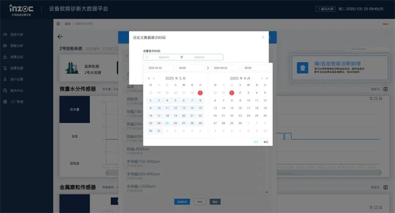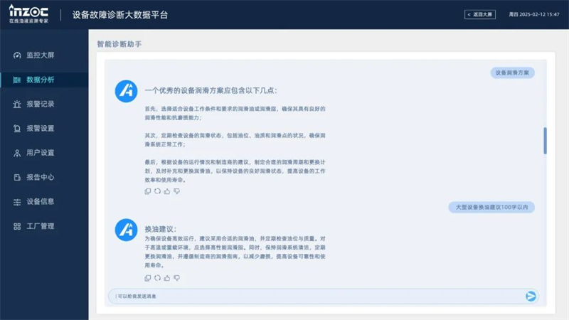 在數據分析詳情頁中,用戶可直接向“智能診斷助手”提出問題(如“齒輪箱磨損要點關注設備哪些狀態指標?”),系統實時解析設備運維專 業問題并生成結論。
