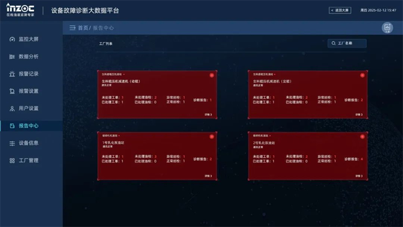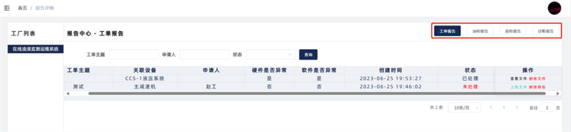 報告中 心 一級界面可總體預覽設備狀態,二級界面深入結合工單記錄、油檢報告、巡檢報告、診斷報告四大核心模塊,構建設備運維全流程閉環管理體系。