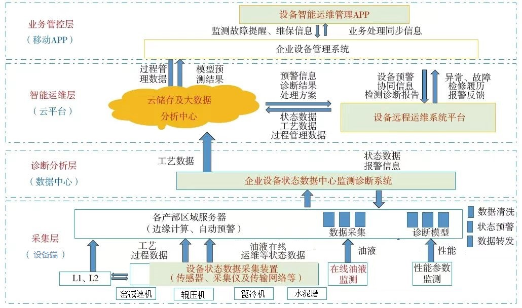 因此運用人工智能和信息網絡等現代技術逐漸轉型升級,推動水泥工業生產、管理和營銷模式的變革,已成為我國水泥工業高質量發展的重要任務。智能制造代表著未來先進制造業的發展方向,在智能制造環境下,現有技術裝備的運行維護管理將受到空前的挑戰。對水泥企業動設備安全狀態把握,設備維修、設備運維的調整和發展方向,是目前水泥設備維修系統研究和規劃的重大課題。而基于油液監測的動設備在線潤滑監控與遠程智能運維云平臺建設,正是現代水泥企業智能制造的重要工作之一。